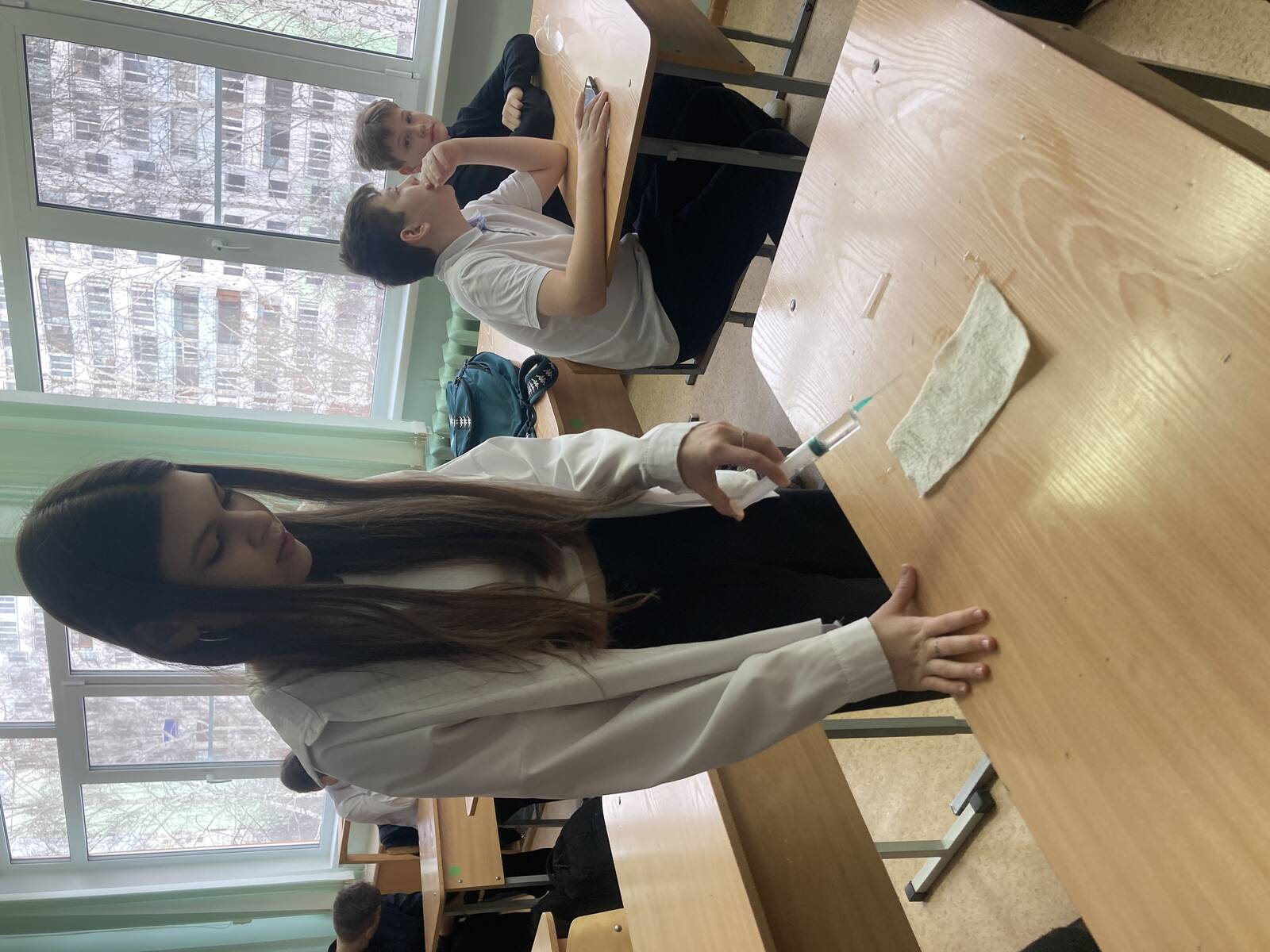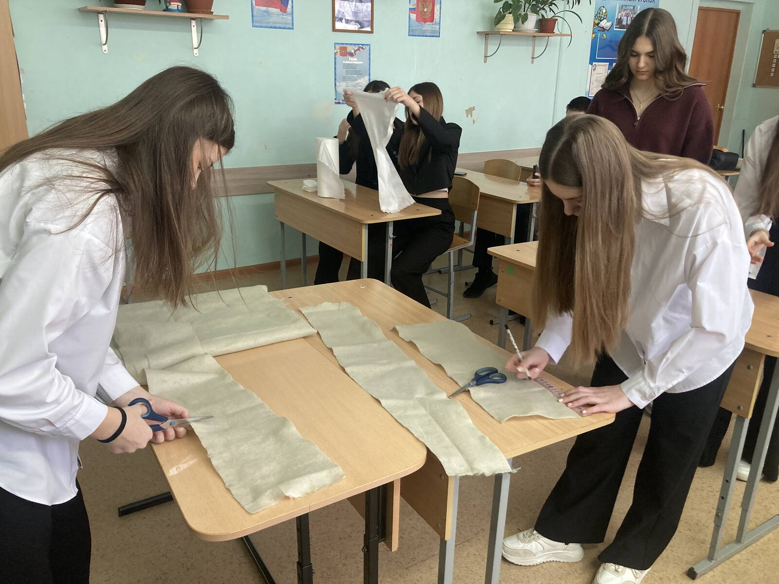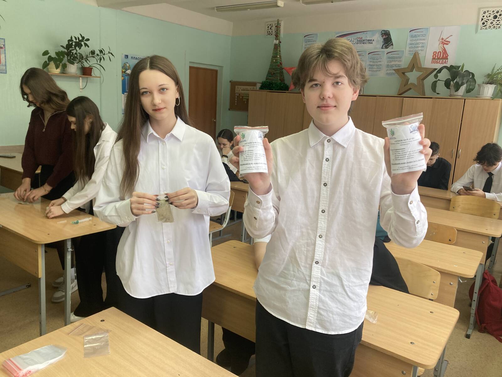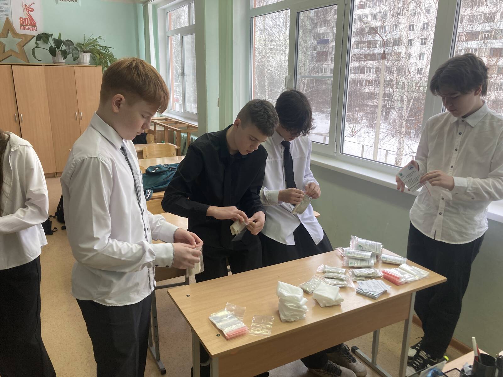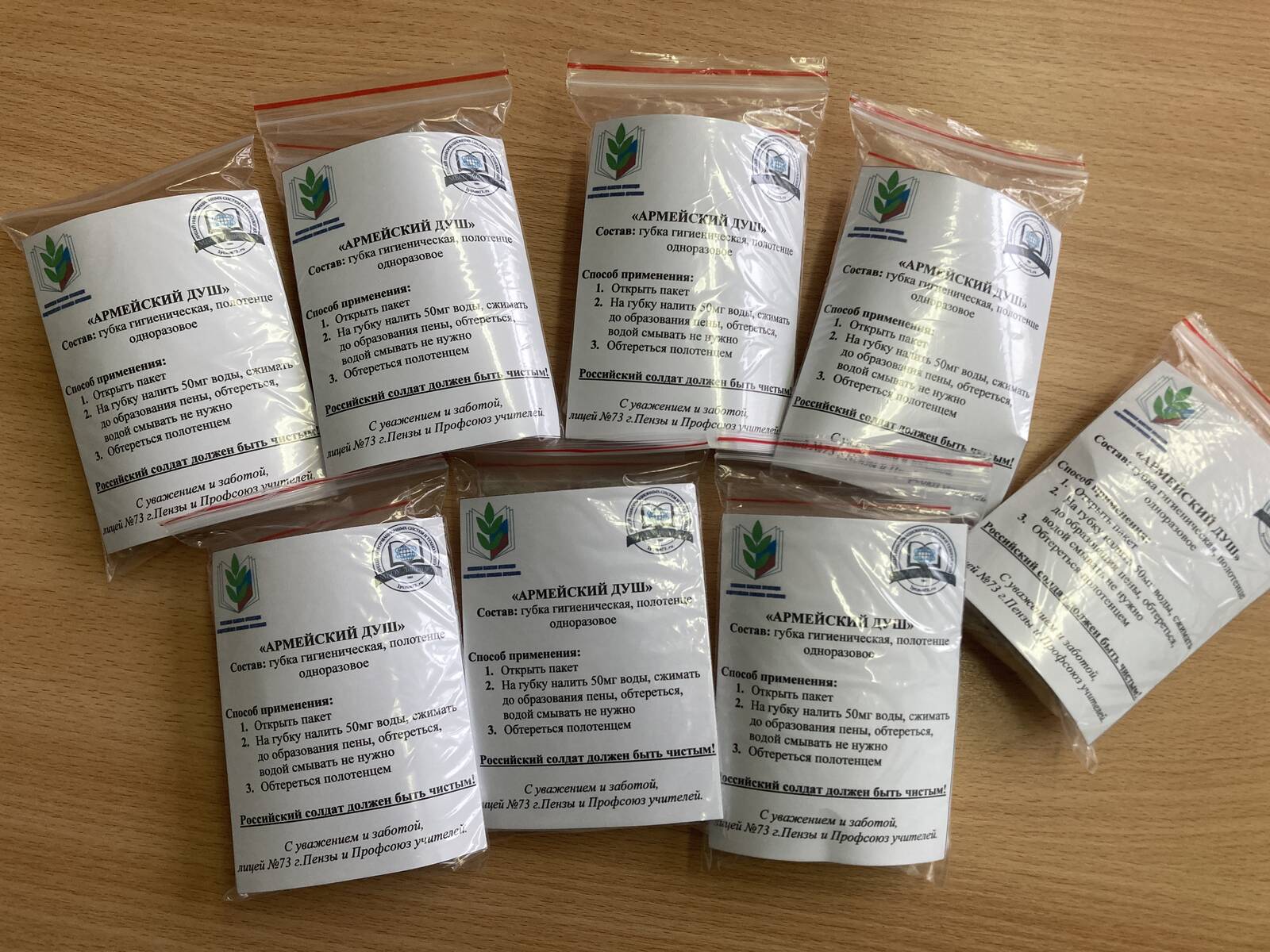 В этот день ученики 8Б класса изготовили более 80 комплектов «сухого» душа для наших солдат – участников Специальной военной операции. Российский солдат должен быть чистым!