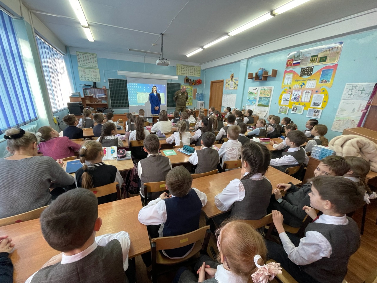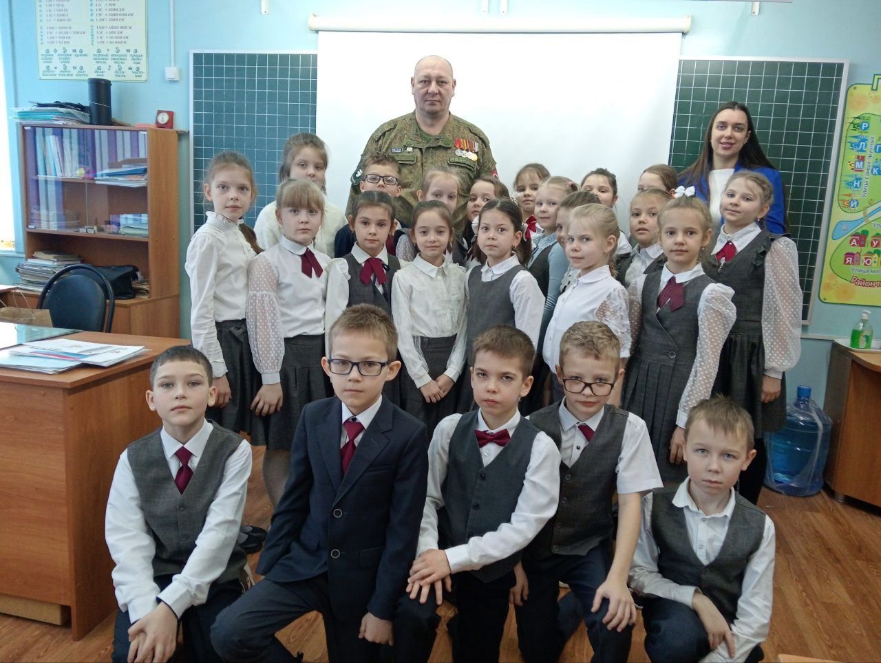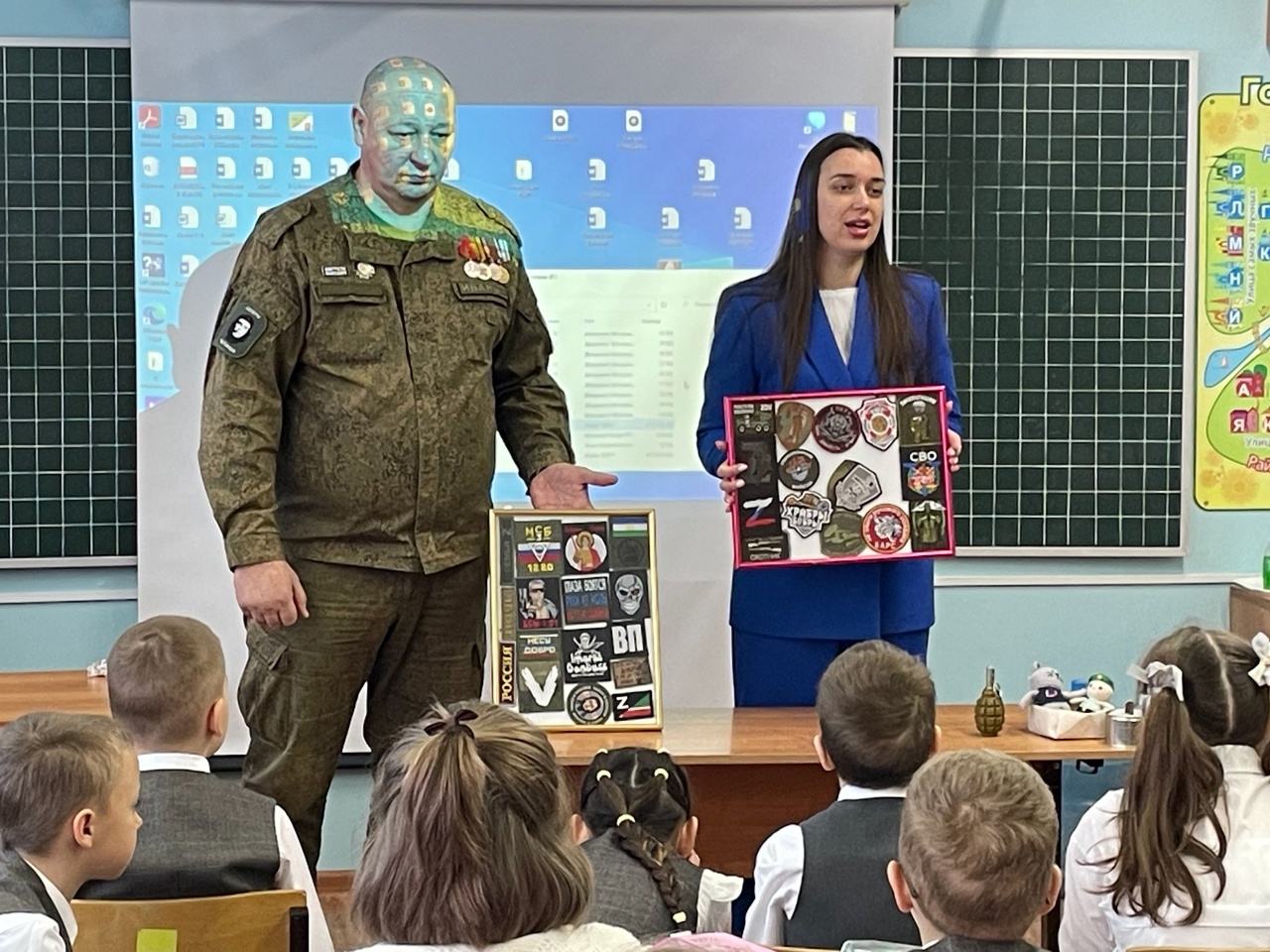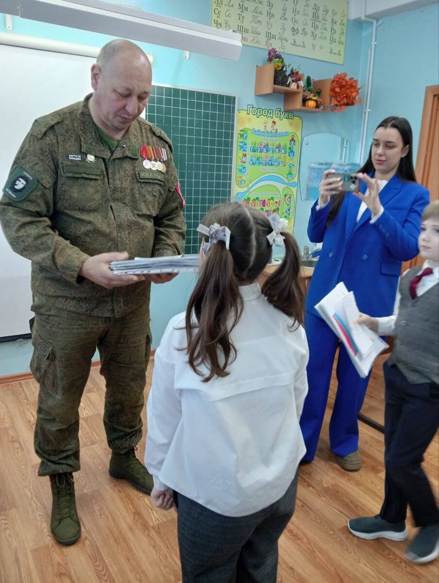 В канун Дня Защитника Отечества у учащихся вторых классов состоялась встреча с ветераном боевых действий и участником СВО Смоляковым Виктором Ивановичем. На которой он рассказал о быте и подвигах наших доблестных защитников. Показал детям шевроны и учебную гранату. Ученики передали рисунки и письма участникам СВО.