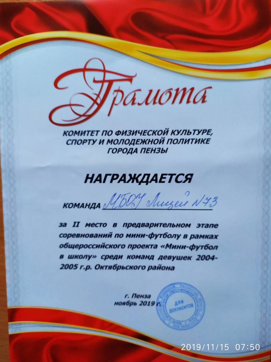 14 ноября в ФОКе «Мечта» прошли соревнования по мини-футболу в рамках общероссийского проекта «Мини-футбол в школу» среди команд девушек 2004-2005 г.р. Октябрьского района. Команда нашего лицея заняла 2 место в предварительном этапе соревнований. Поздравляем!