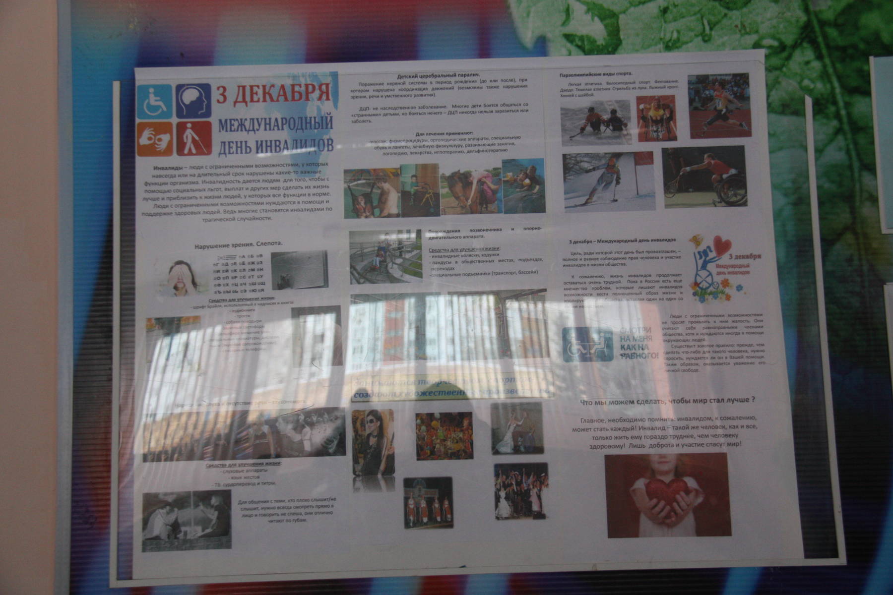 03 декабря - Международный день инвалидов. В фойе 1 этажа лицея размещен стенд с информацией, который посвящен данному дню.