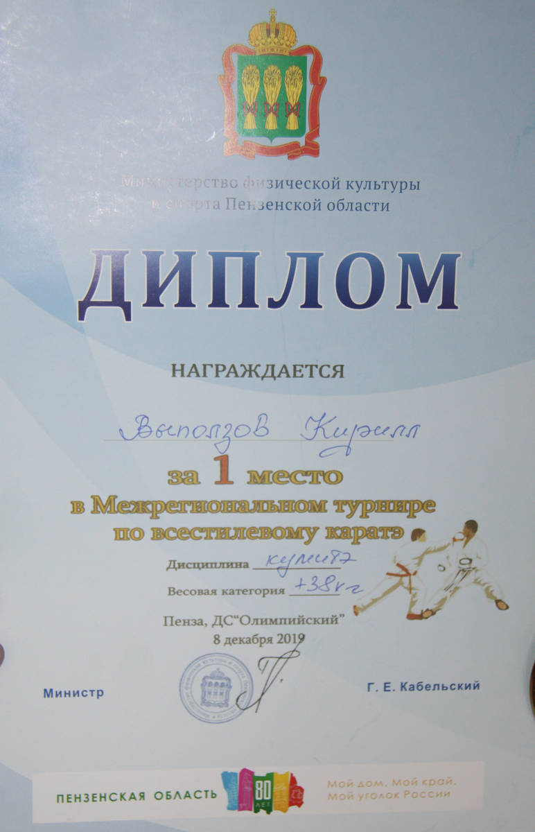 8 декабря 2019 ученик 5В класса Выползов Кирилл принял участие в Межрегиональном фестивале по всестилевому каратэ и занял I место в дисциплине кумитэ в весовой категории +38 кг. Поздравляем!