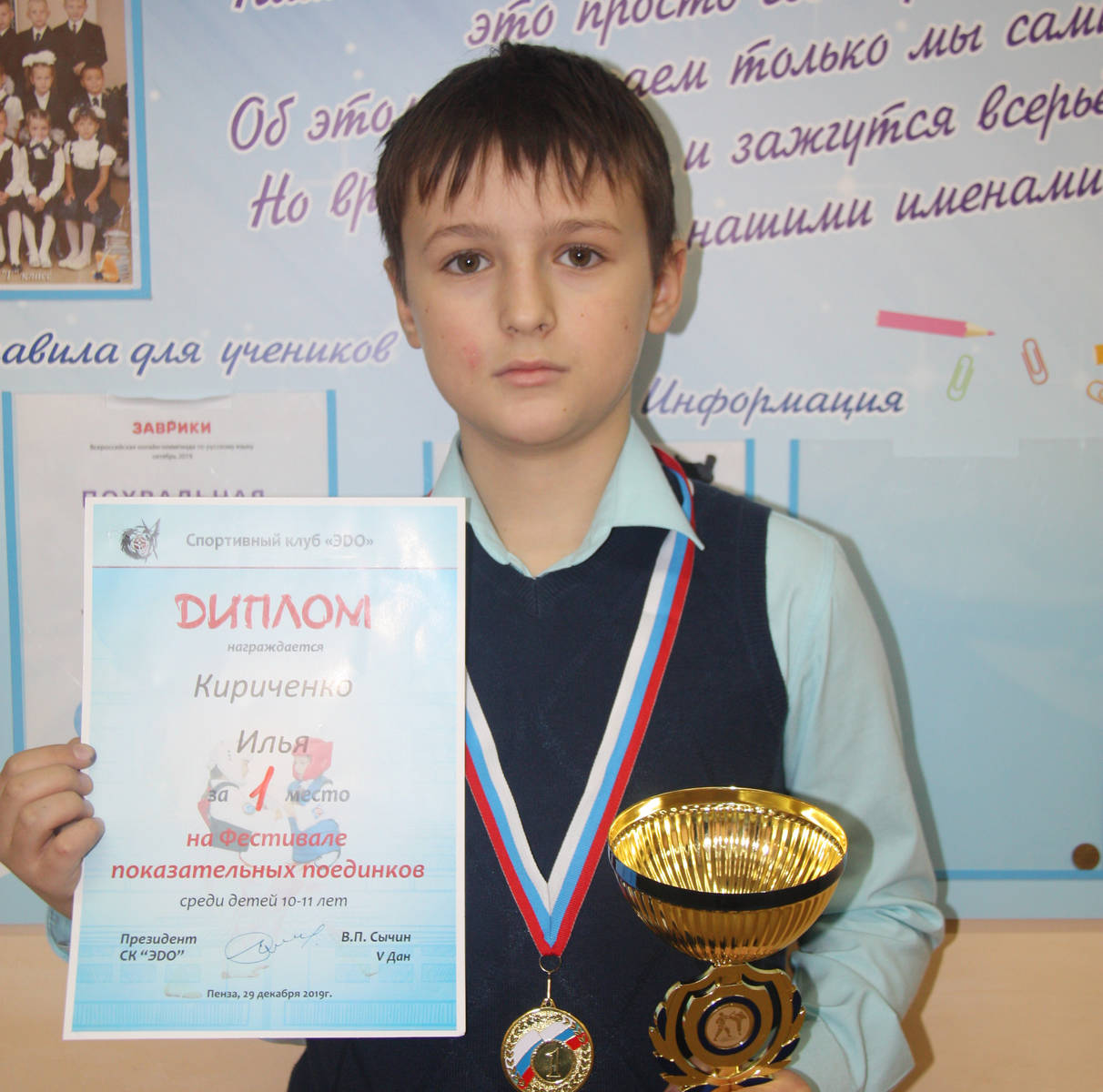 29 декабря в спортивном клубе «Эдо» (каратэ кекусинкай г.Пензы) прошел Фестиваль показательных поединков среди детей 10-11 лет. Кириченко Илья, ученик 4Г класса, занял 1 место. Поздравляем и желаем дальнейших спортивных успехов.