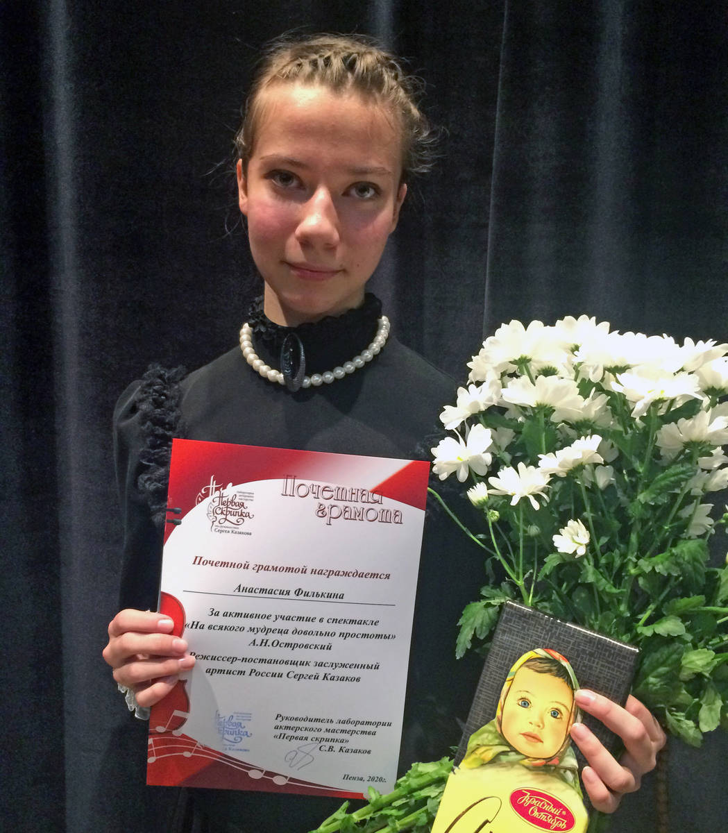 20 января на малой сцене Пензенского областного драматического театра им. А.В.Луначарского состоялась премьера спектакля "На всякого мудреца довольно простоты" по пьесе А.Н. Островского под руководством заслуженного артиста России Сергея Казакова. Смешная поучительная комедия актуальна и в нашем современном мире. Она показывает зрителям главные пороки человечества - глупость, лживость, подхалимство. В спектакле играли актёры - ученики лаборатории актёрского мастерства «Первая скрипка». В роли богатой и властной вдовы Софьи Игнатьевны Турусиной - ученица 9А класса Анастасия Филькина.